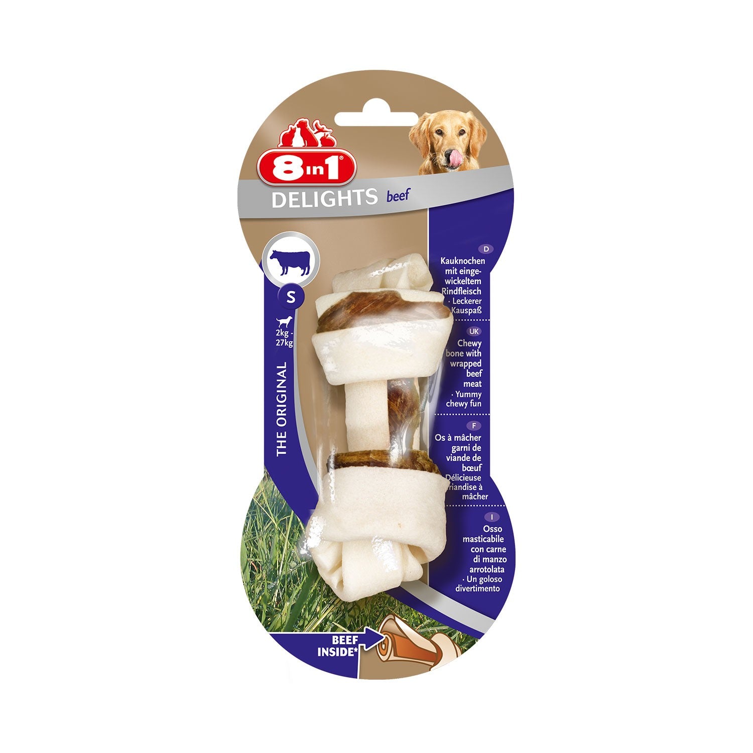 I Delights Beef Bones di 8in1 sono degli snack da sgranocchiare a basso contenuto di grassi, composti da pelle di manzo e deliziosa carne di manzo per una masticazione intensiva e a lunga durata. Sono ricchi di proteine, privi di coloranti e appetizzanti artificiali. Durante la cottura non vengono aggiunti zucchero, OGM e glutine. Disponibili in differenti formati per soddisfare le esigenze di tutti i cani, dal più piccolo al più grande.