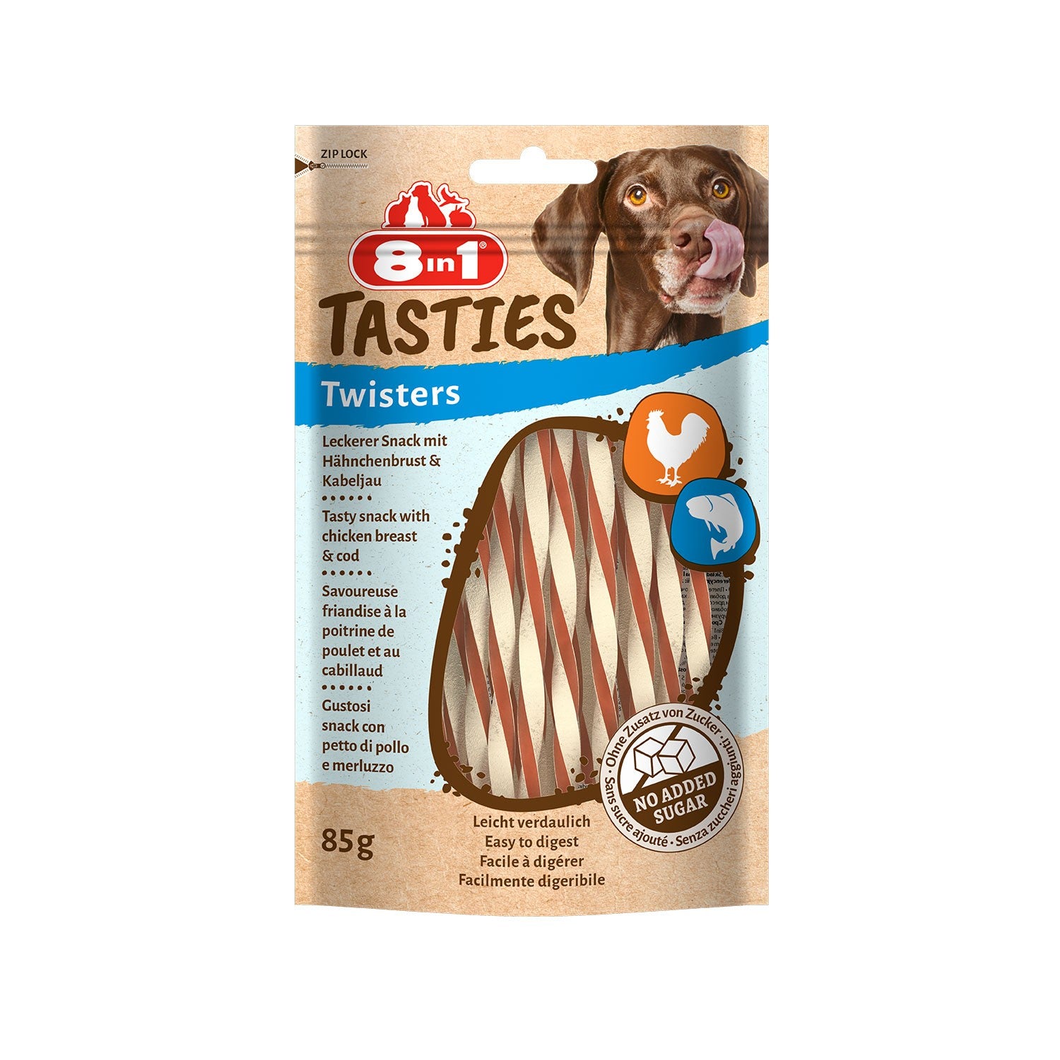 I 8in1 Tasties Twisters sono snack-ricompense per cani a base di delizioso petto di pollo avvolto in gustoso merluzzo a forma di bastoncini arrotolato, ideali tra un pasto e l'altro. Le proteine, della quale sono ricchi, favoriscono una massa muscolare magra per una forma fisica ottimale.