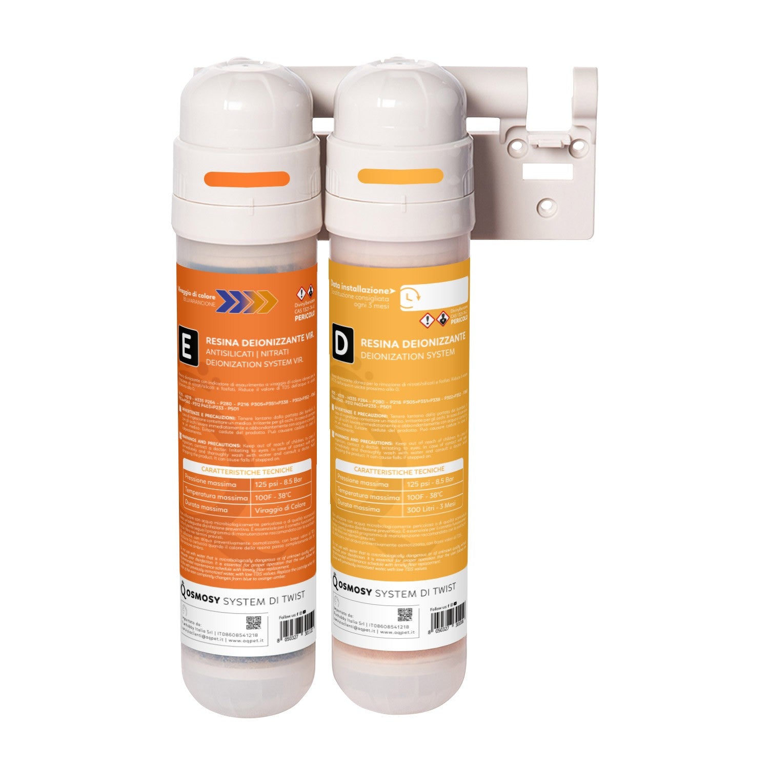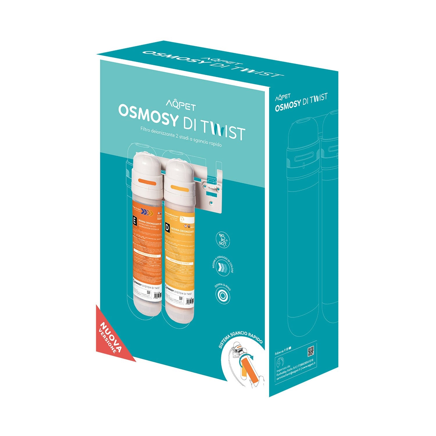 Il sistema Osmosy Di Twist è un filtro deionizzante a 2 stadi che risulta essere l’accessorio complementare per il nostro impianto Aqpet Osmosy Twist, ma può essere utilizzato anche con altri impianti osmosi presenti sul mercato. Le cartucce sulla sua unità sono progettate per una facile installazione e sostituzione, con sistema a sgancio rapido. Ogni cartuccia si collega facilmente al suo alloggiamento semplicemente inserendo e ruotando. Ideale per l’abbattimento di TDS e NO3- , PO43-, SiO4.