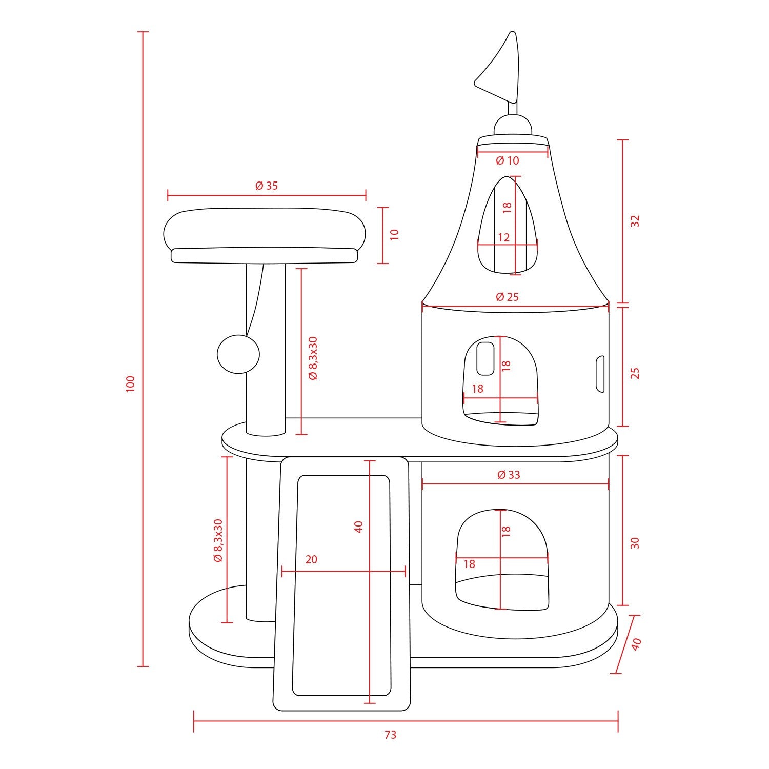 Il tiragraffi Dubai è progettato come un vero e proprio castello a tre piani, fornendo al vostro felino diverse aree di intrattenimento e relax. La struttura è coronata da una bandierina che rende l’esperienza ancora più divertente, alimentando l’immaginazione dei vostri gatti mentre si arrampicano e si muovono all'interno di questo regno felino. I diversi livelli di questo graffiatoio per gatti permettono al gatto di esplorare vari punti di osservazione, stimolando la sua curiosità e i suoi istinti naturali.