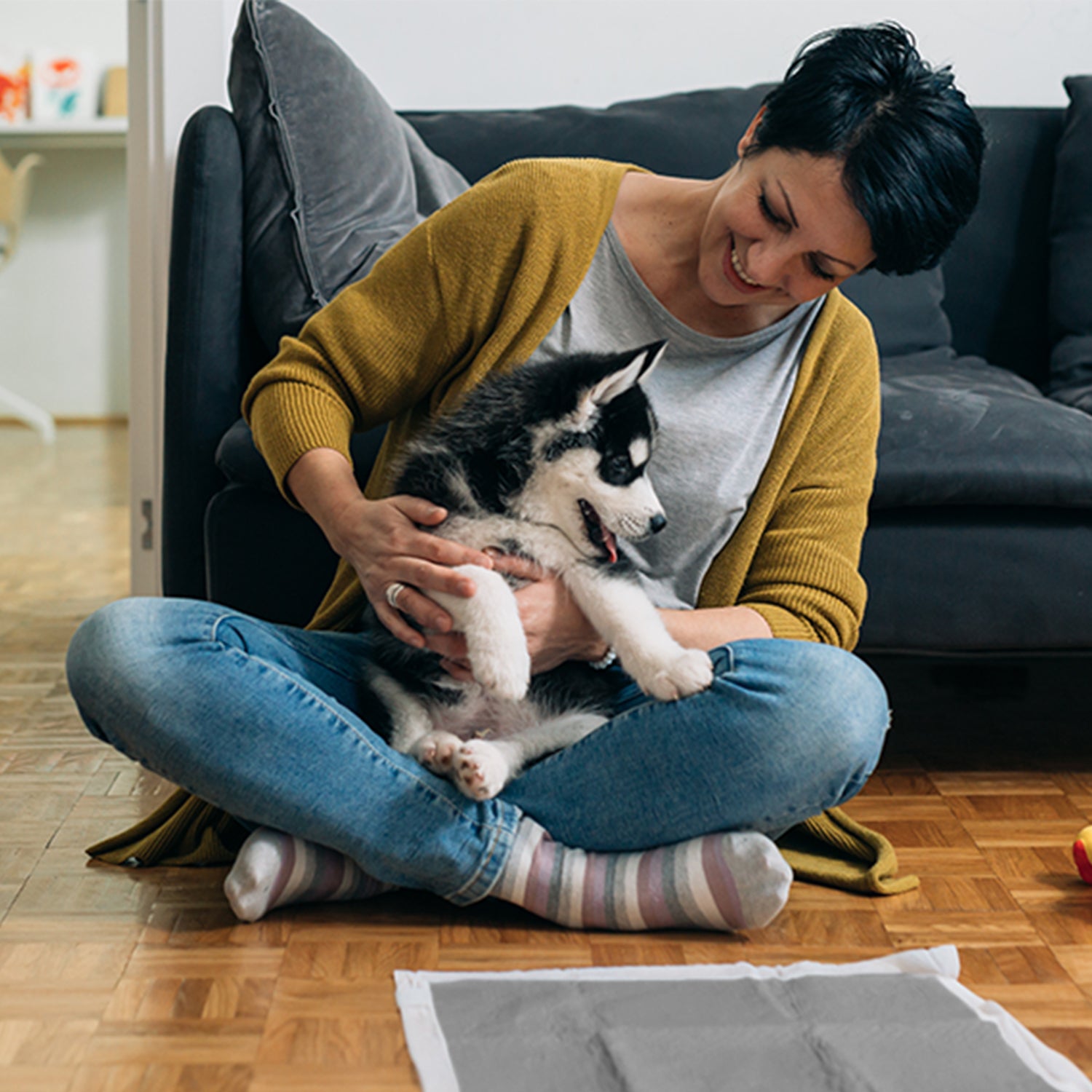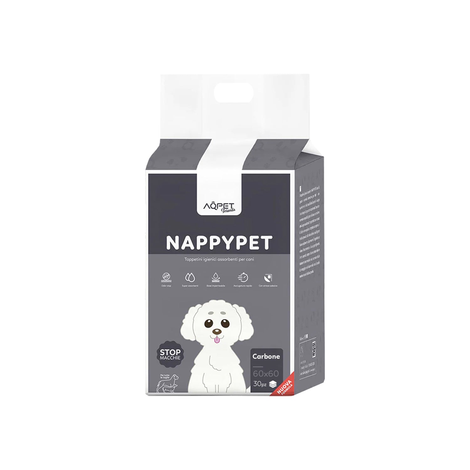 Nappy Pet Carbo targati Aqpet, sono dei tappetini assorbenti igienici, adatti per tutti i cani quando non si ha la possibilità di portarli fuori per i loro bisogni e/o per cani incontinenti. Composti da uno strato di carbone attivo vegetale che neutralizza gli odori.