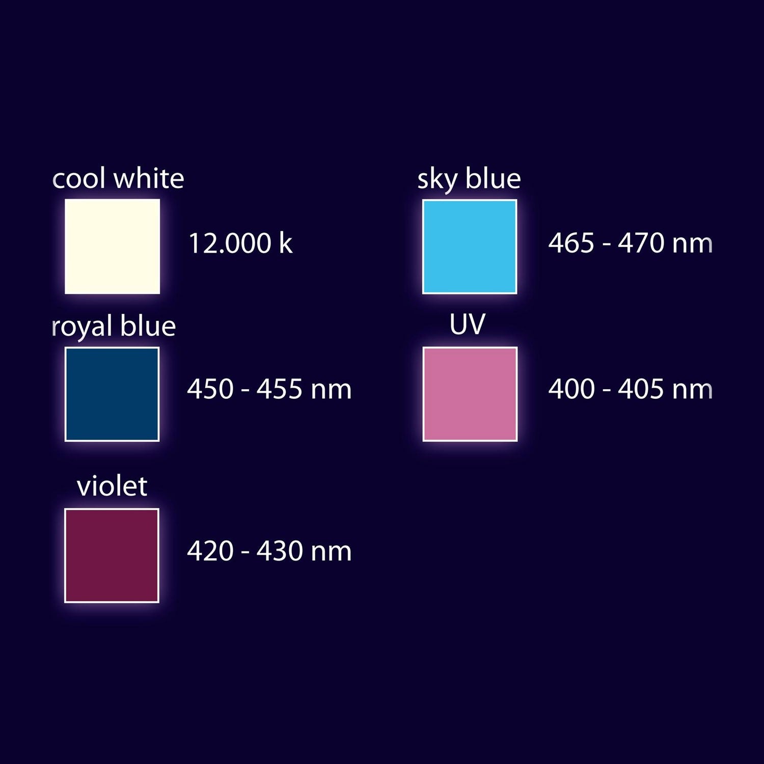 Il grappolo di luci è composto da 24 Led individuali con 5 canali colore e uno spettro bilanciato. Il colore e l'intensità della luce sono regolabili manualmente attraverso 2 canali. La crescita dei coralli è supportata e la biologia dell'acquario si sviluppa in modo naturale, grazie all’intensità di luce appositamente studiata.