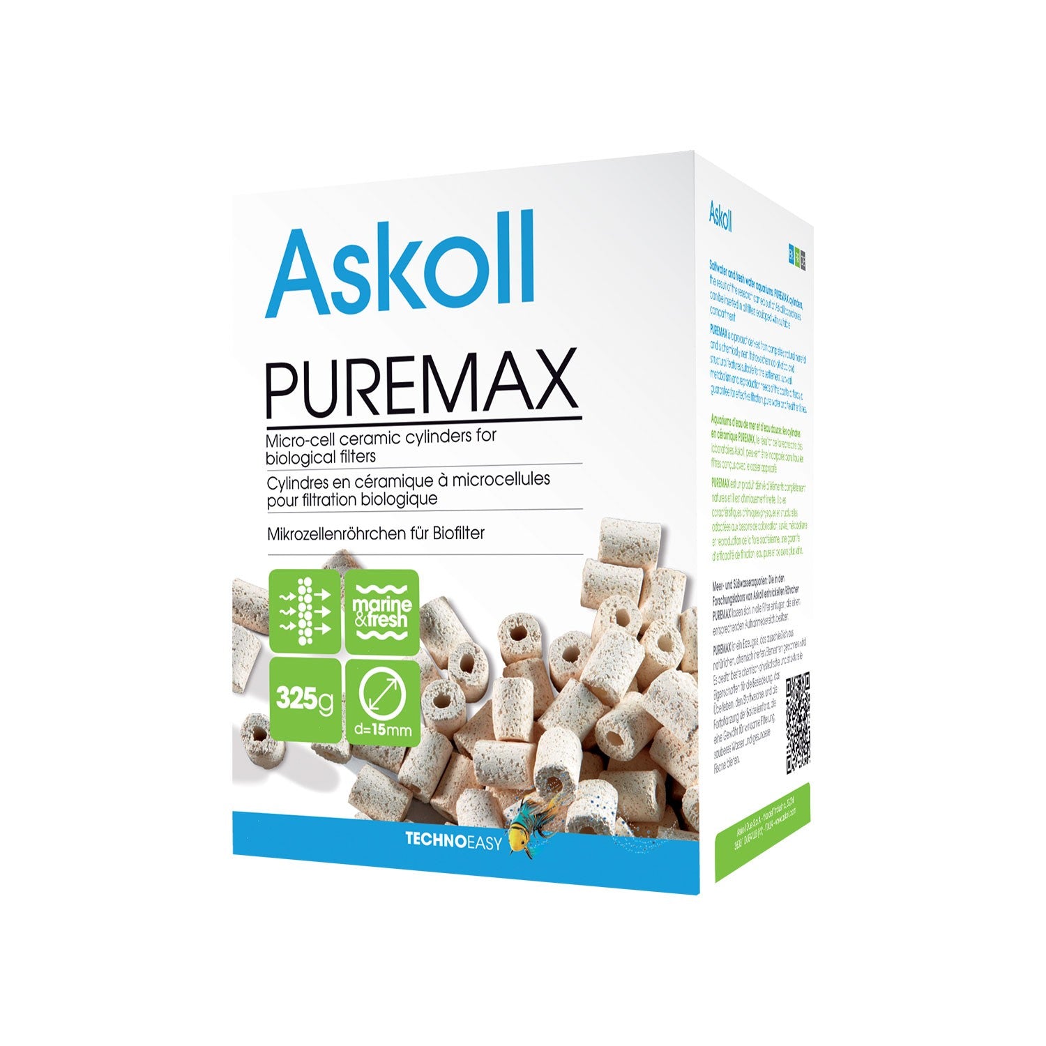 Pure Max di Askoll è un materiale filtrante composto da cannolicchi a microcelle per acquari dolci e marini. Possiedono le caratteristiche chimico-fisiche e strutturali adeguate alle esigenze di insediamento, sopravvivenza, metabolismo e riproduzione delle flore batteriche. Garanzia di filtraggio efficace, acqua pura e pesci più sani. Adatti a tutti i tipi di filtri.