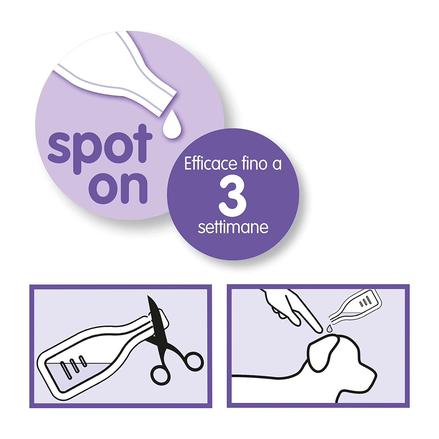 Applicare ogni settimana uno spot on direttamente sul pelo tra le orecchie in modo che il cane non si possa leccare. Il prodotto diventa attivo entro un’ora dall’applicazione. Se il vostro animale domestico dovesse bagnarsi, applicare nuovamente lo spot on poiché l’effetto del prodotto potrebbe ridursi.