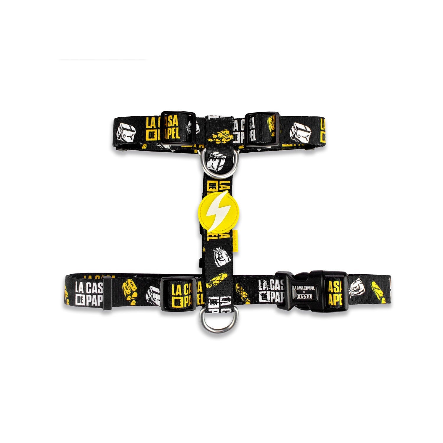 La pettorina ad H, modello La Casa di Carta Golden, targata Dashi, è la classica pettorina ad H posteriore dal design originale ed innovativo, caratterizzato dalla fantasia in pieno stile Netflix della famosa serie spagnola LCDP (La Casa de Papel) che rende il tuo fido amico il più “cool” della strada. Potete scegliere tra le quattro versioni extra-small, small, medium, large per incontrare le esigenze dei vostri amici animali. E’ composta da poliestere resistente di alta qualità con una fibbia dotata di un sistema di bloccaggio a quattro punti per garantire la massima sicurezza. Caratteristica particolare della pettorina è la presenza di due anelli in metallo sul retro in modo da avere più possibilità di scelta nel posizionamento del guinzaglio.