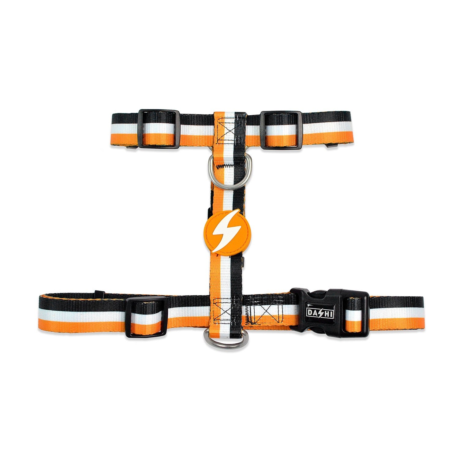 La pettorina ad H, modello Stripes3 Arancione/Nero, targata Dashi, è la classica pettorina ad H posteriore in uno stile completamente nuovo ed originale, caratterizzata da una fantasia a strisce multi-colore per rendere il tuo fido amico il più “cool” della strada. Potete scegliere tra le quattro versioni extra-small, small, medium, large per incontrare le esigenze dei vostri amici animali. E’ composta da poliestere resistente di alta qualità con una fibbia dotata di un sistema di bloccaggio a quattro punti per garantire la massima sicurezza. Caratteristica particolare della pettorina è la presenza di due anelli in metallo sul retro in modo da avere più possibilità di scelta nel posizionamento del guinzaglio.