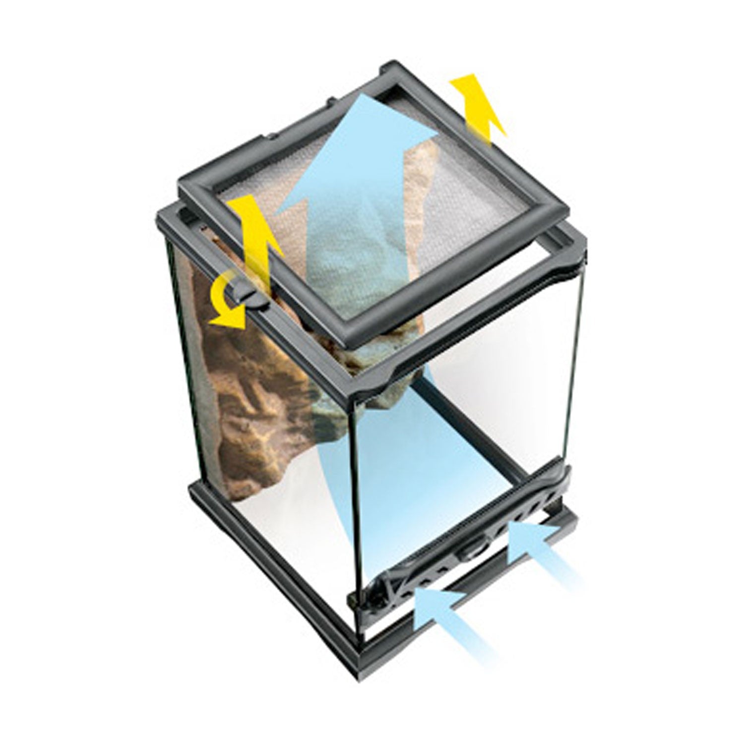 • E' presente una pratica aerazione frontale che, combinata con una copertura in rete a maglia fine in acciao inox, permettere una doppia ventilazione e un ottimo scambio calora-aria. Questo scambio permette di immagazzinare il calore nei terrari desertici e di mantenere l'umidità in quelli tropicali.