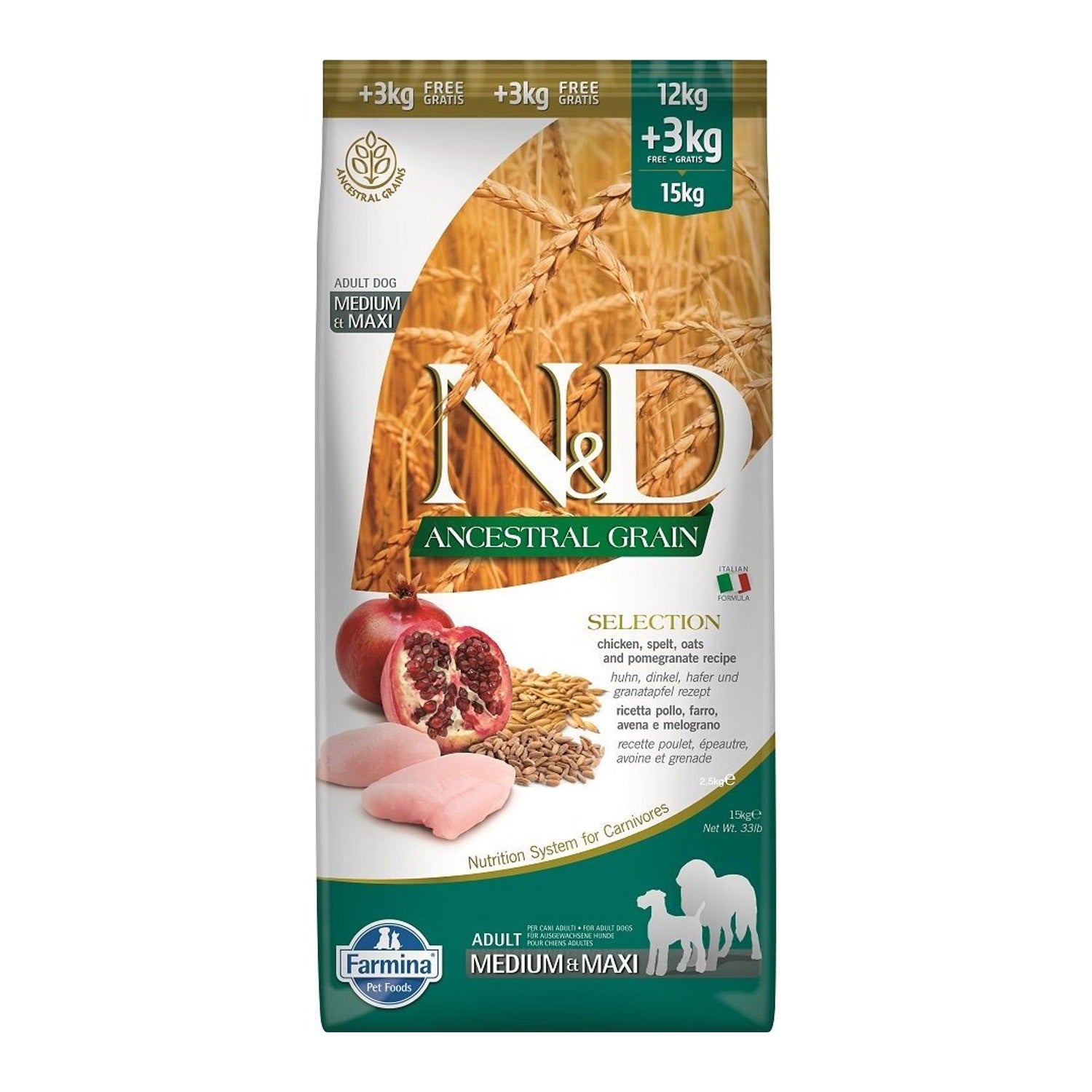 Alimento completo per cani adulti di taglia media e grande, con ingredienti di prima qualità, come pollo e melograno, e cereali selezionati, come farro e avena, a basso contenuto di carboidrati.