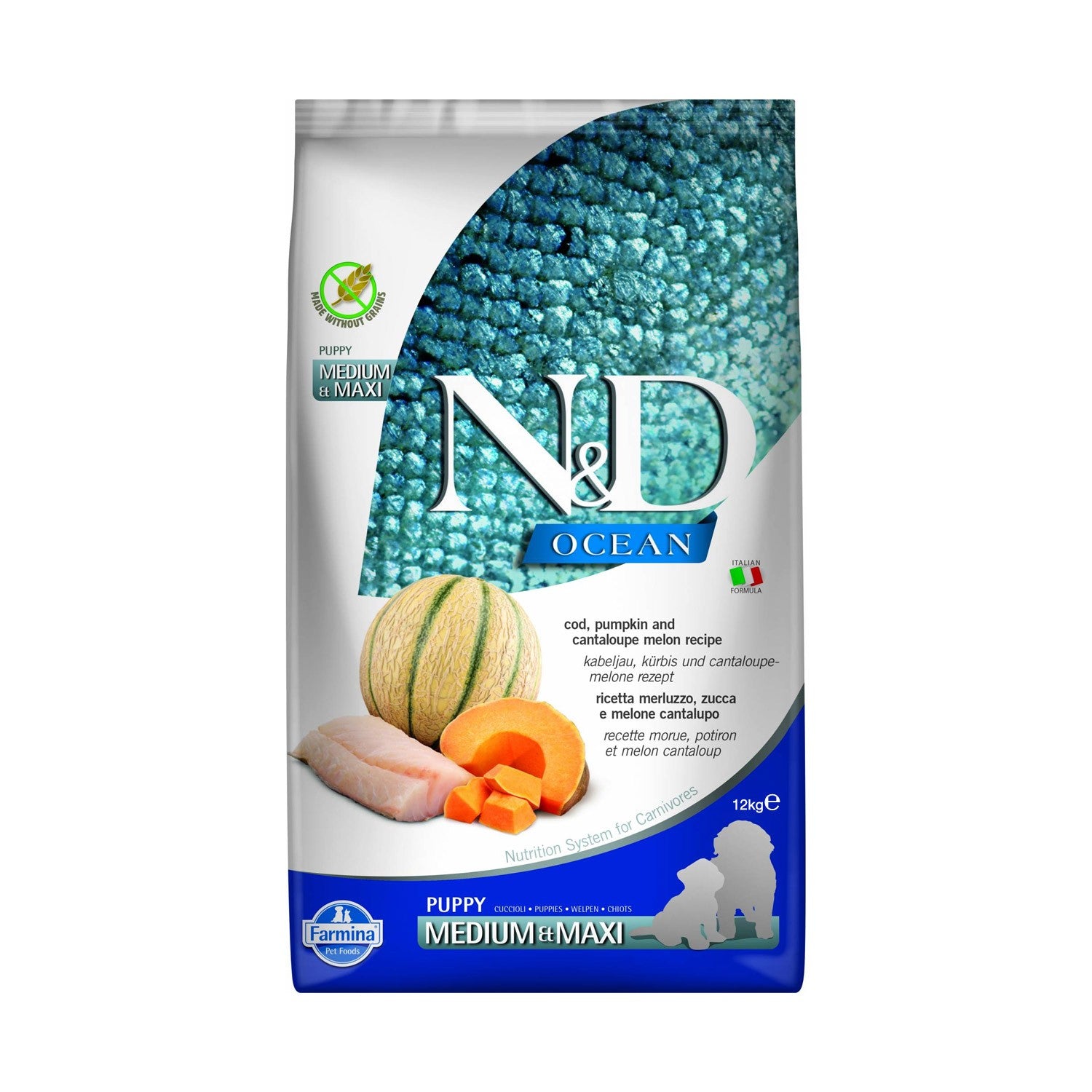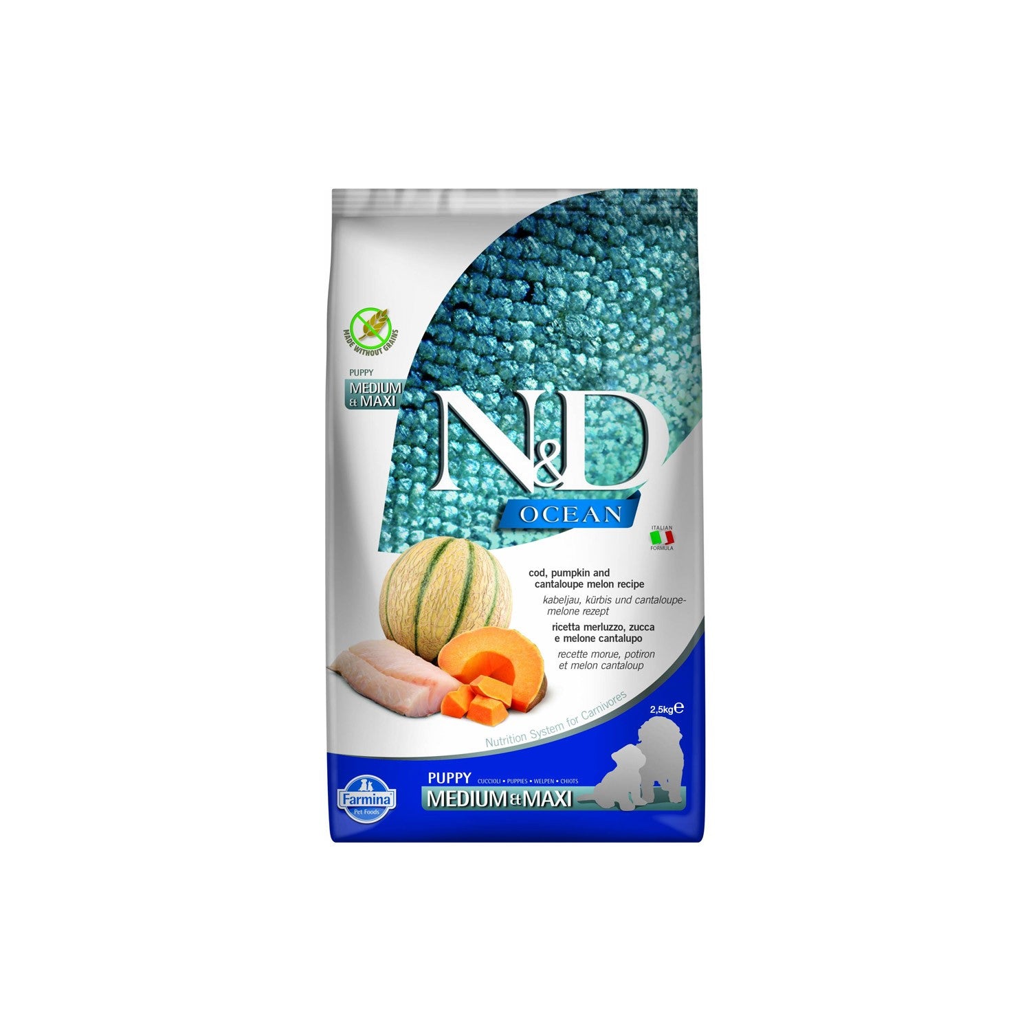 Alimento completo per cani cuccioli e cani femmina in gravidanza o gestazione di taglia media e grande, con ingredienti di prima qualità come merluzzo fresco e melone cantalupo.