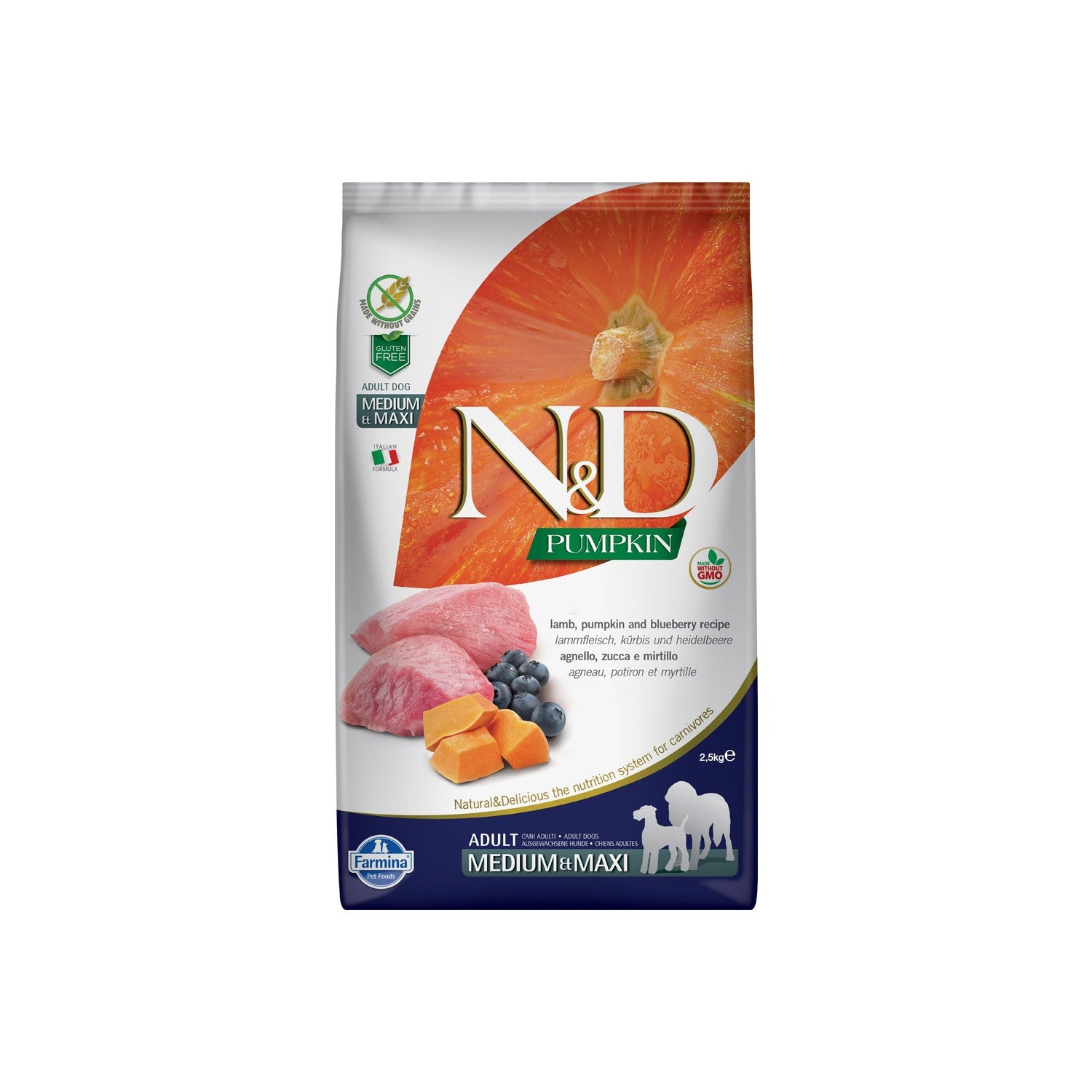 Alimento completo per cani adulti di taglia media e grande con ingredienti di prima qualità come zucca, agnello e mirtilli.