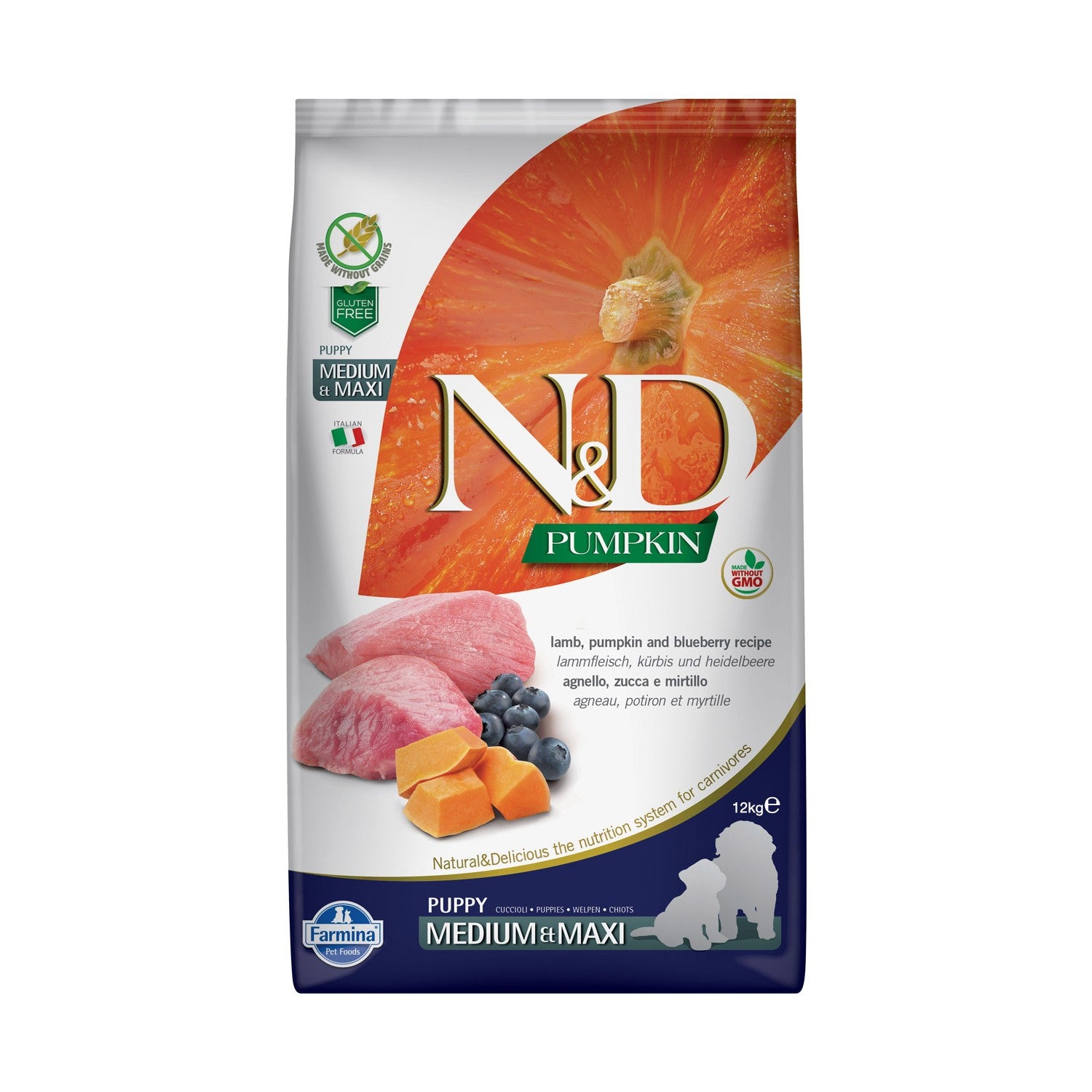 Alimento completo per cuccioli e per cagne in gestazione o in allattamento di taglia media e grande con ingredienti di prima qualità come zucca, agnello e mirtilli.