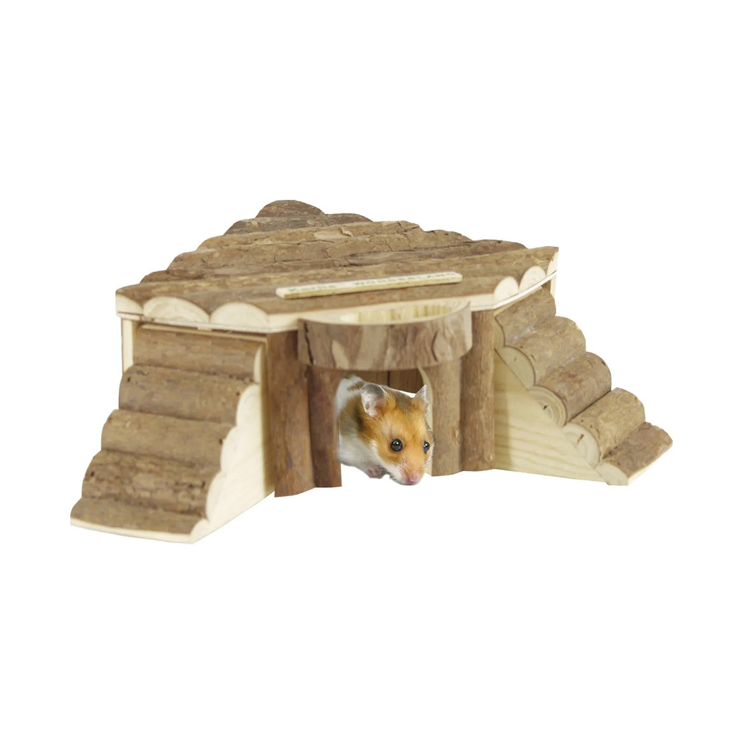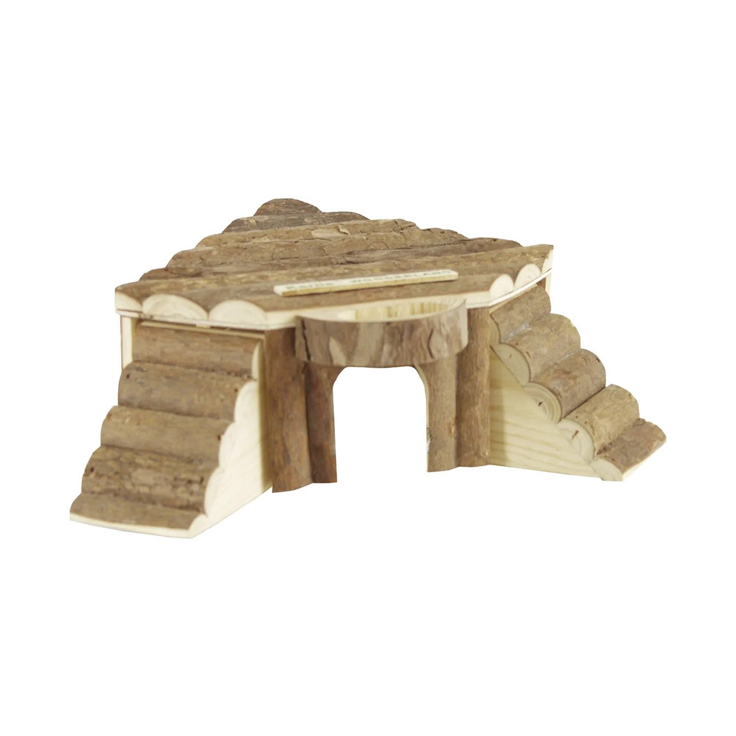 Casetta angolare in legno naturale, progettata per offrire ai tuoi roditori un rifugio sicuro e comodo. Con rampe per un facile accesso al punto di osservazione sul tetto, questa casetta angolare garantisce spazio e comfort. Realizzata in legno resistente e sicuro, è l'habitat ideale per piccoli animali che amano esplorare e arrampicarsi. Perfetta per conigli, gerbilli e altri roditori