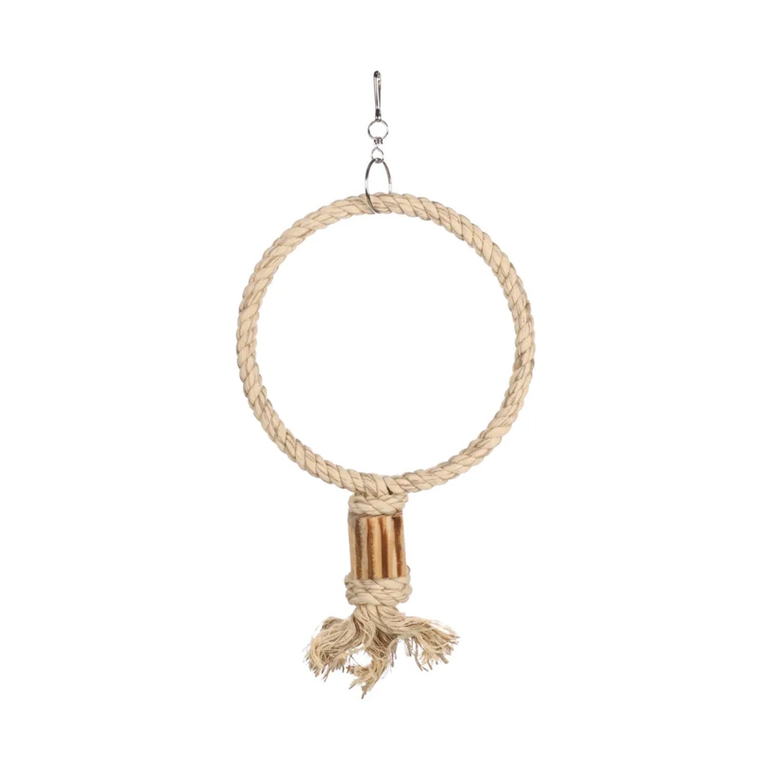 Il posatoio ad anello è realizzato con una corda di sisal naturale intrecciata a formare un anello circolare. Questo design è pensato per consentire al volatile di appoggiarsi comodamente, giocare e muoversi liberamente. Il sisal è un materiale ecologico, resistente e sicuro per il becco e le zampe degli uccelli, perfetto per offrire una superficie naturale sulla quale i parrocchetti possono appollaiarsi. Il sisal è particolarmente adatto per gli uccelli che amano beccare e mordere, poiché è robusto e resiste all’usura quotidiana.