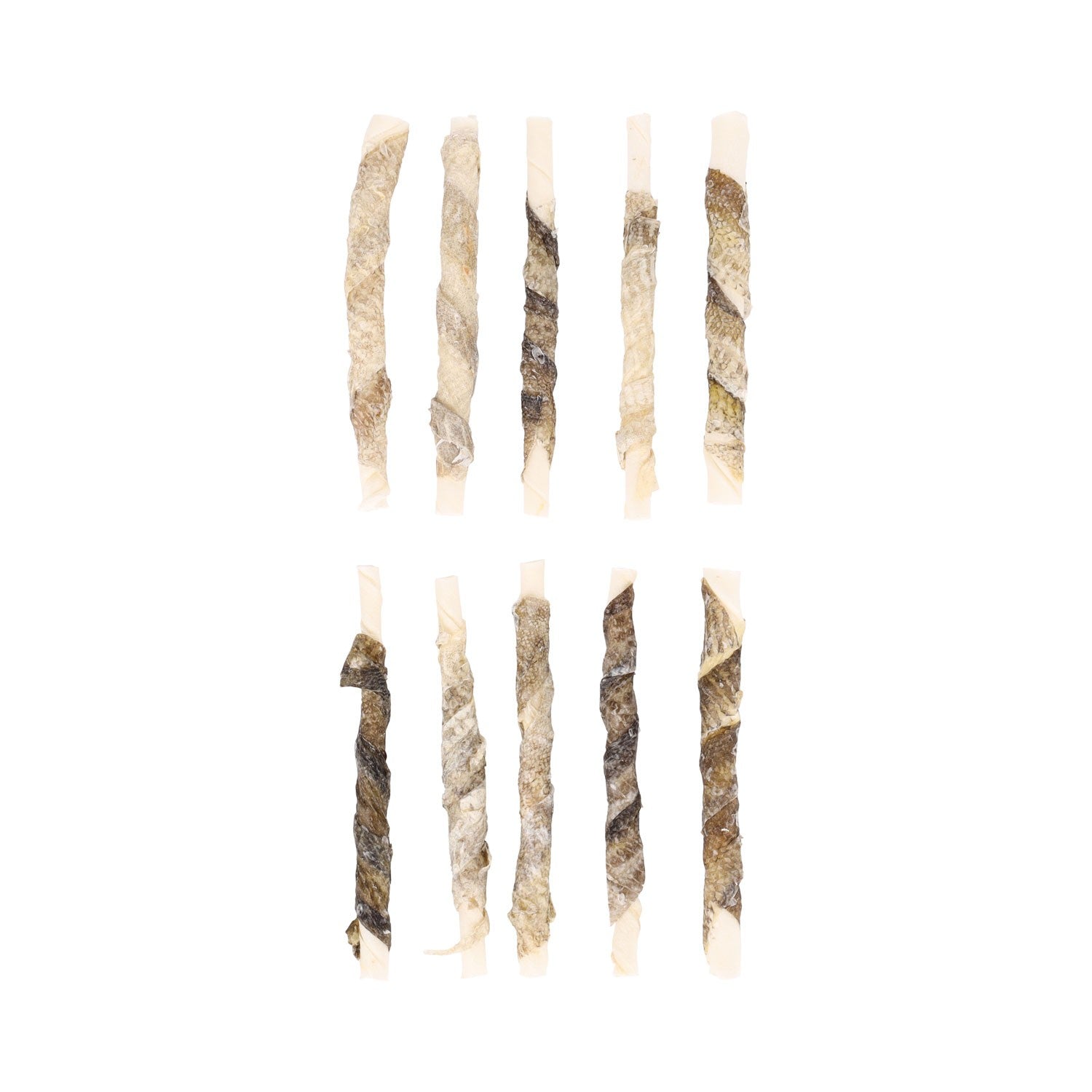 Il bastoncino è composto da pelle di pesce selezionata, un ingrediente pregiato che arricchisce l’alimentazione del cane con proteine di alta qualità e acidi grassi omega-3 e omega-6. Questi nutrienti supportano la salute della pelle, favoriscono un manto lucente e possono contribuire a migliorare la salute delle articolazioni. Il gusto naturale e intenso della pelle di pesce soddisfa anche i palati più esigenti, rendendo ogni bastoncino un momento di puro piacere per il tuo cane.