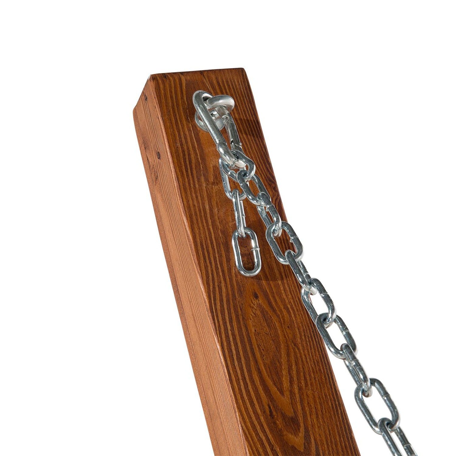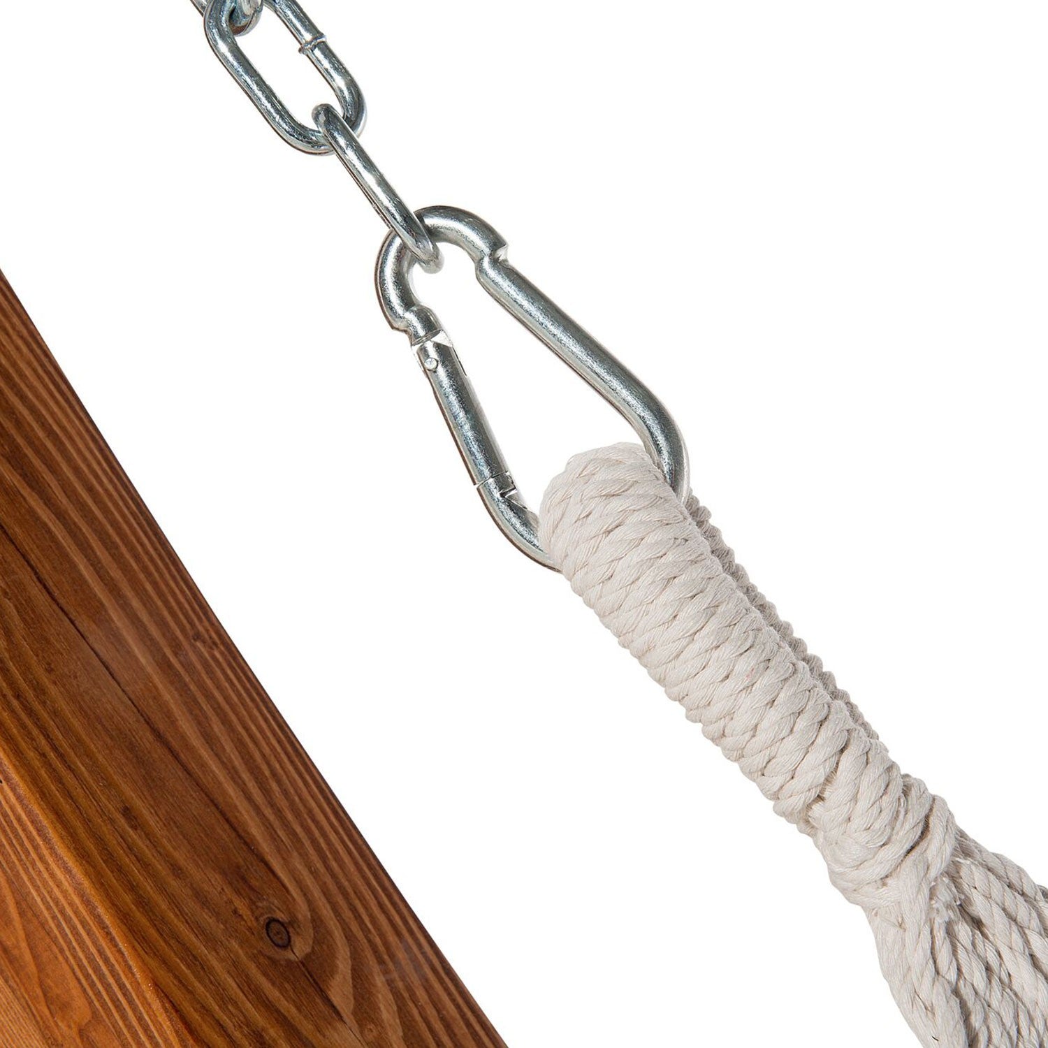 Le catene di sospensione e i moschettoni dell'amaca matrimoniale da giardino Flur sono realizzati in acciaio inossidabile di alta qualità, garantendo una resistenza ottimale e un'installazione rapida e semplice. I ganci zincati e le catene in acciaio consentono una tenuta sicura e regolabile in altezza, permettendoti di personalizzare la tua esperienza di relax.