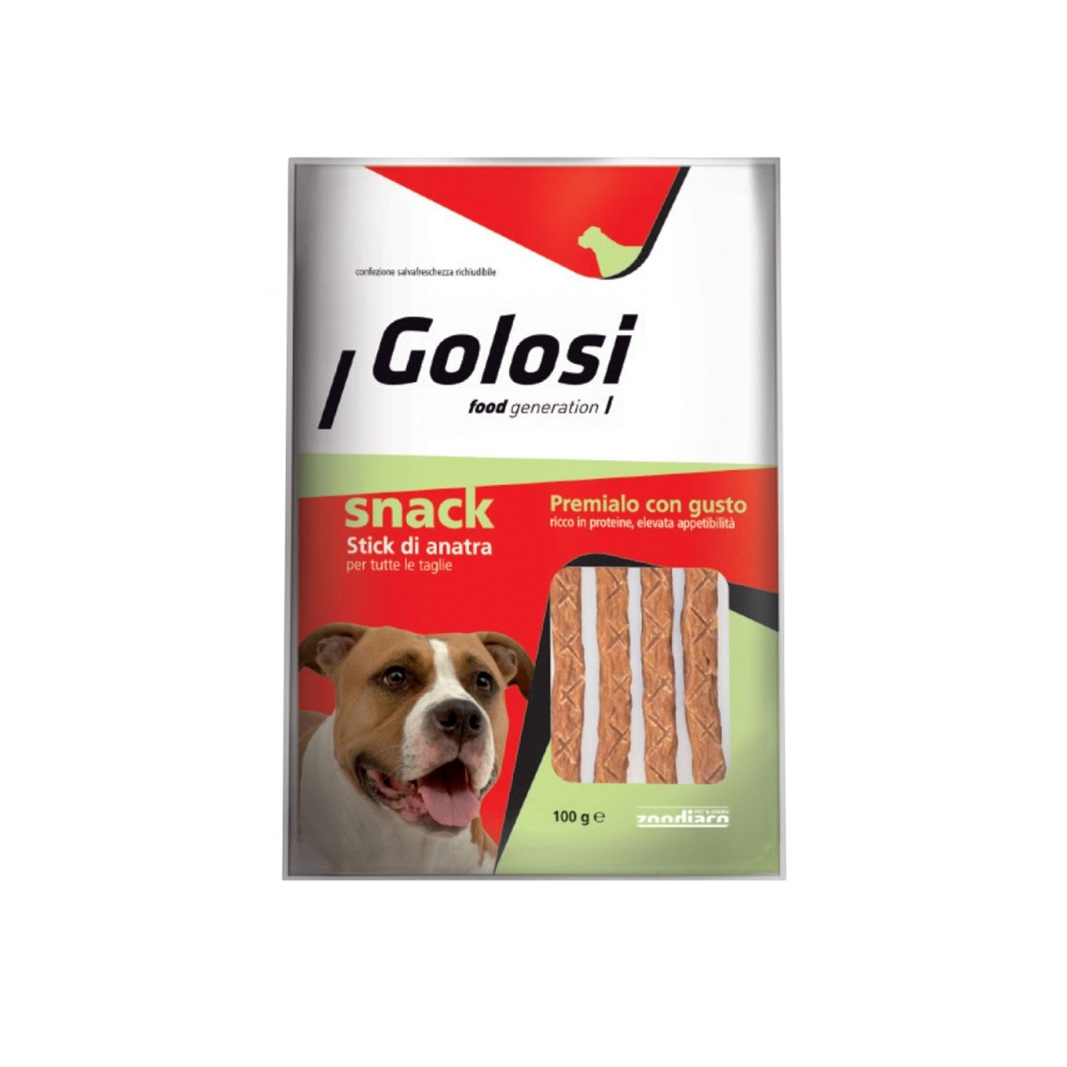 Alimento complementare composto da stick con anatra, per cani di tutte le taglie. Senza aromatizzanti aggiunti, ad elevata appetibilità e basso contenuto di grassi. Confezione richiudibile.