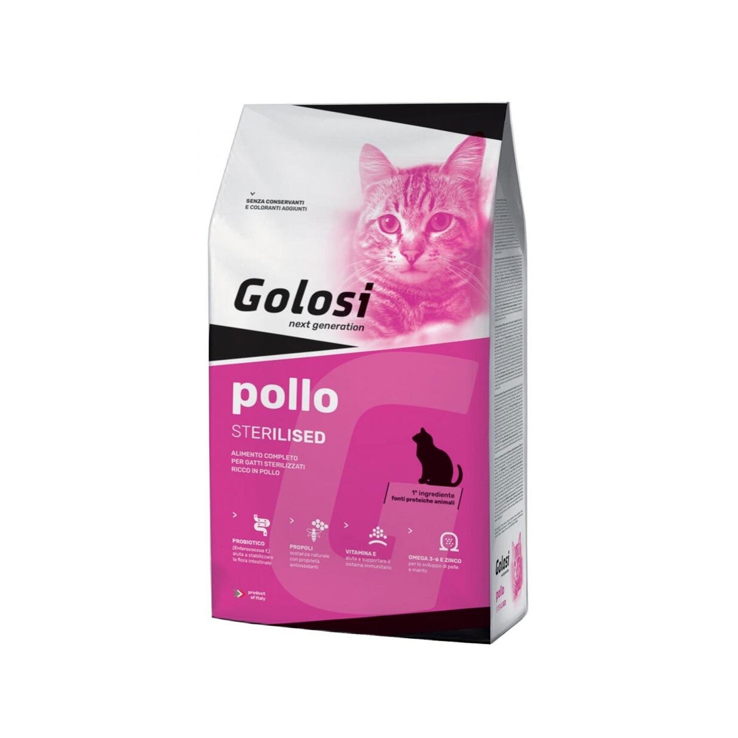 L’alimentazione per gatti proposta da Golosi Sterilised include un ampio spettro di vitamine e probiotici per favorire una digestione sana e un sistema immunitario reattivo. La presenza della taurina, essenziale per la vista e la salute cardiaca, completa un profilo nutrizionale che rispetta le esigenze fisiologiche dei gatti adulti sterilizzati.