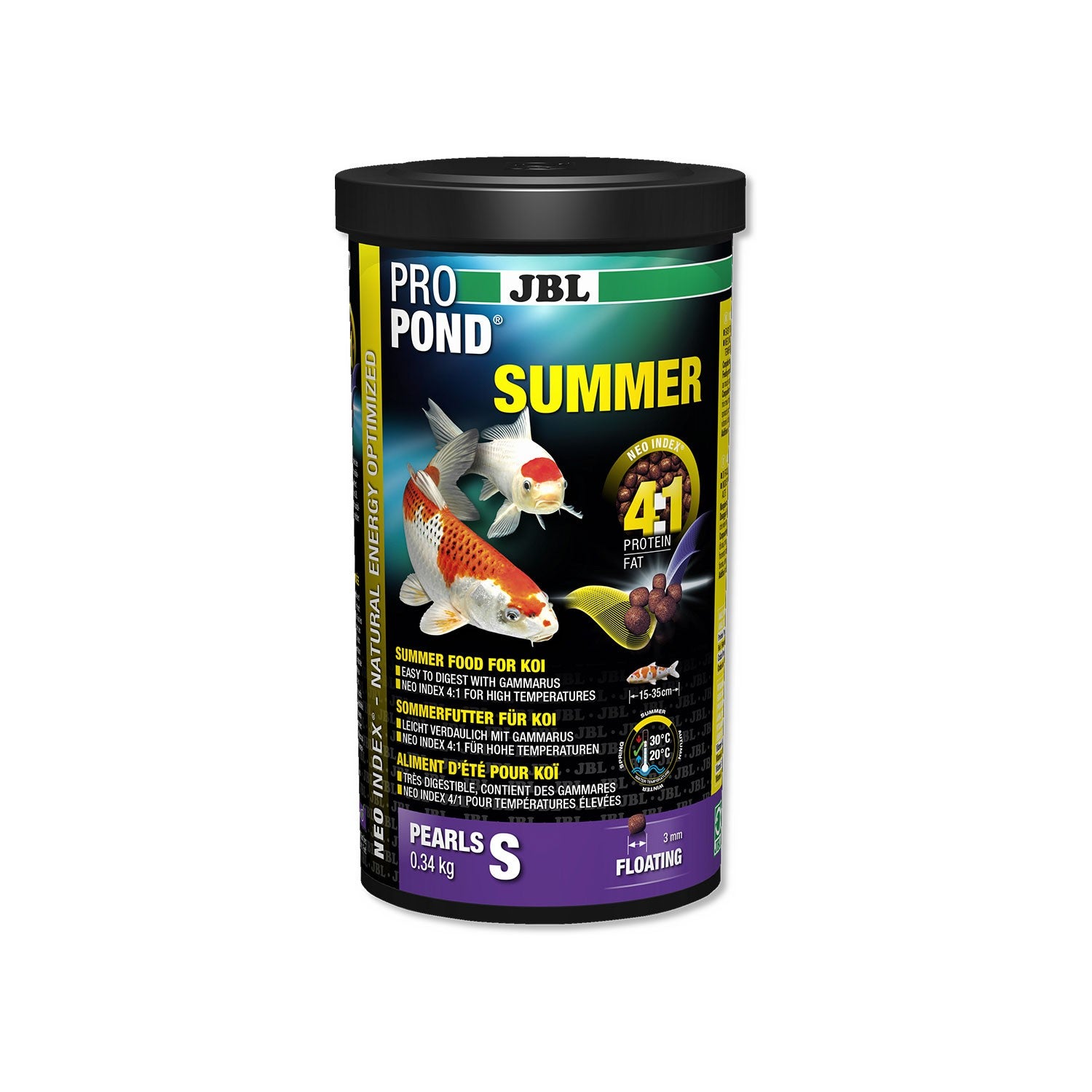 Il JBL PROPOND Summer S è un mangime completo progettato appositamente per le carpe koi di piccola taglia durante la stagione estiva. Con un equilibrato rapporto proteine-grassi di 4:1 secondo il NEO Index, offre una nutrizione ottimale che tiene conto della temperatura dell'acqua, della taglia, dell'età e della funzione dei tuoi pesci.