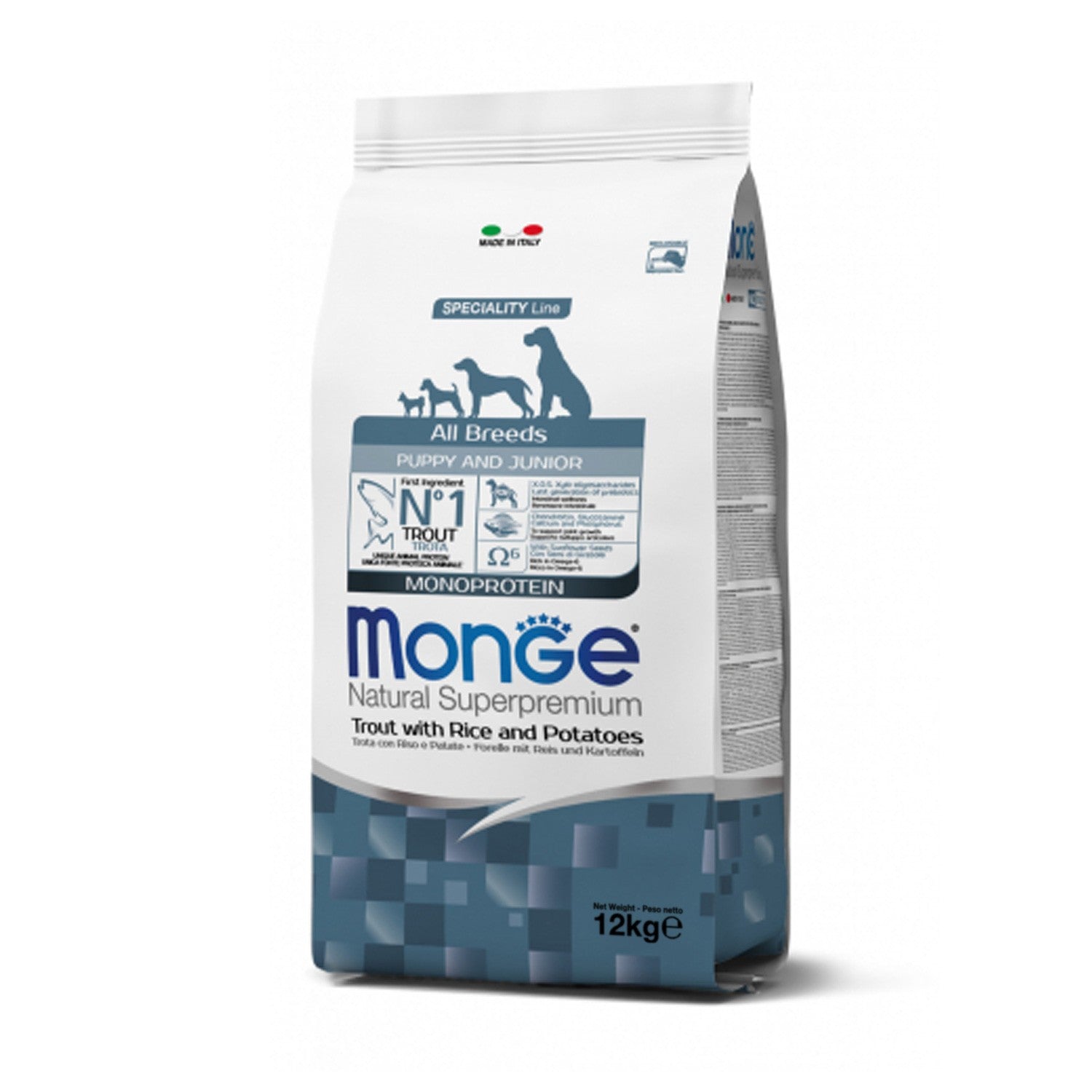 Monge Natural Superpremium All breeds Puppy and Junior Monoprotein* Trota con Riso e Patate è un alimento completo per cani cuccioli di tutte le taglie. Specificamente sviluppato pensando al benessere del tuo cane, grazie alla presenza di sostanze nutritive di qualità frutto della ricerca Made in Italy.