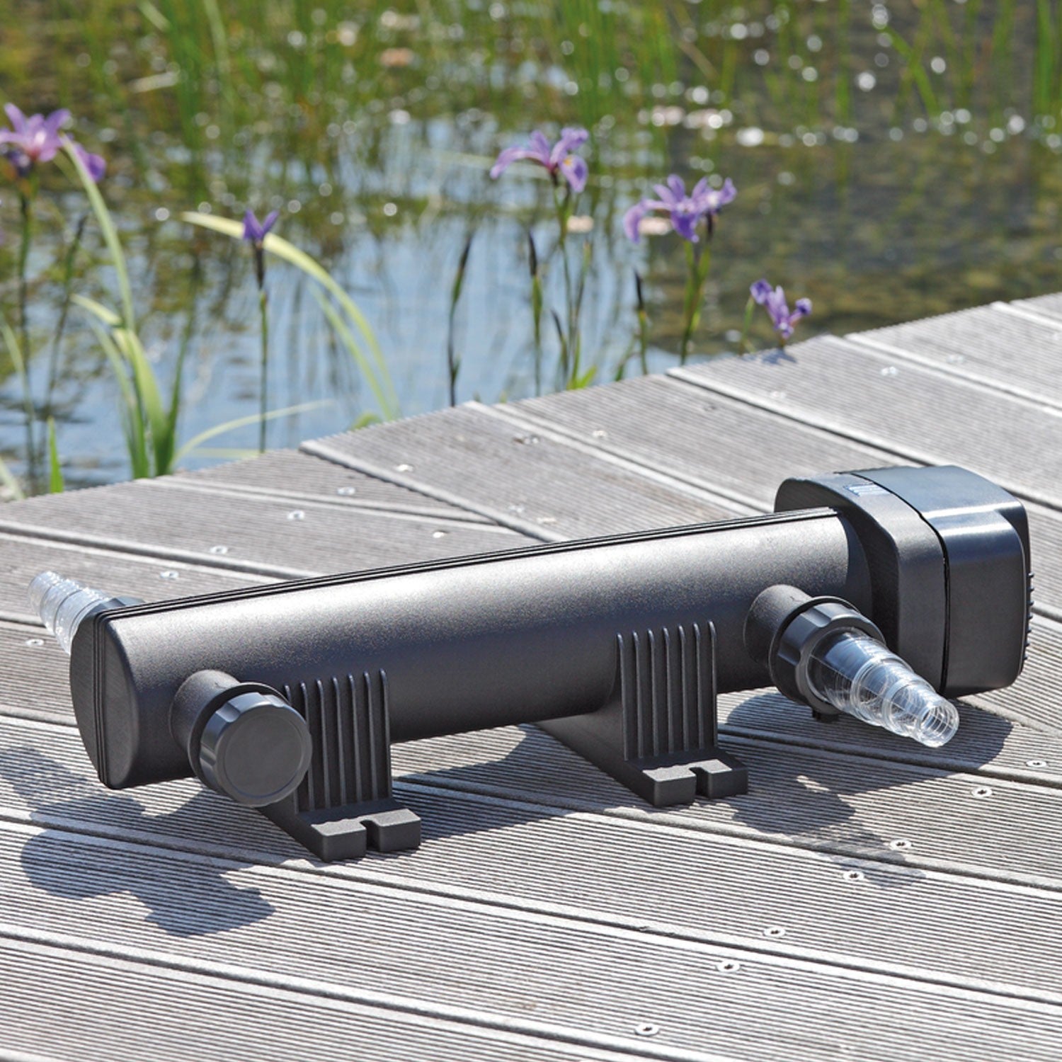 Oase Vitronic è un dispositivo UVC progettato per rimuovere le alghe galleggianti, batteri e germi dal laghetto. Utilizza la luce ultravioletta per distruggere la struttura cellulare delle alghe, impedendo la loro crescita e migliorando la qualità dell'acqua. È particolarmente efficace nei laghetti di tutte le dimensioni e si integra facilmente con i sistemi di filtraggio esistenti.