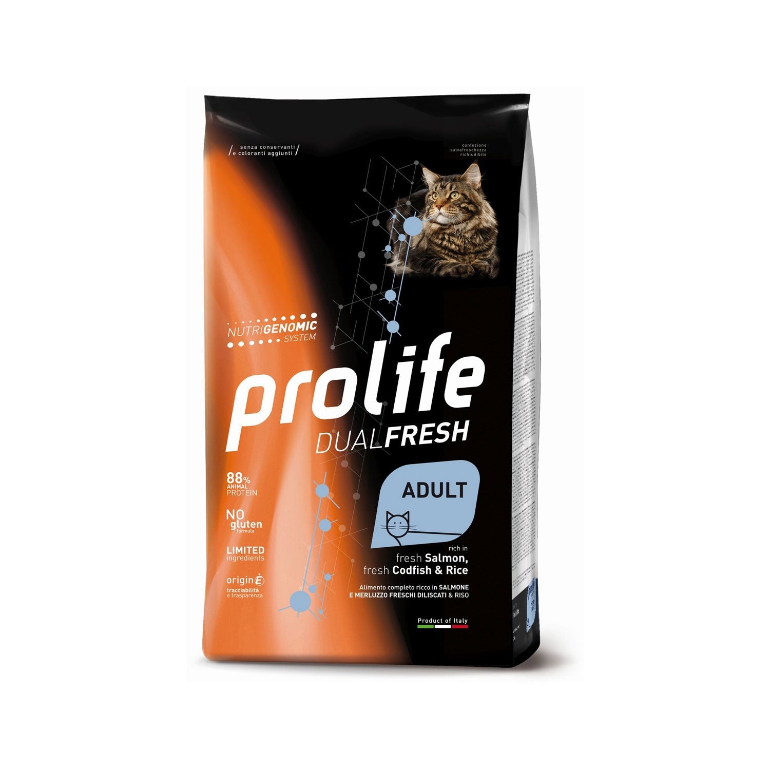 Prolife Dual Fresh è un alimento completo pensato per soddisfare le esigenze nutrizionali specifiche dei gatti adulti. La sua formula unica, composta principalmente da salmone e merluzzo freschi insieme al riso di origine italiana, offre un mix bilanciato di proteine, omega-3, e vitamine ad alta digeribilità. Questo cibo per gatti adulti, privo di glutine, è adatto a tutti i gatti, e garantisce una dieta equilibrata per mantenere la loro salute e vitalità.
