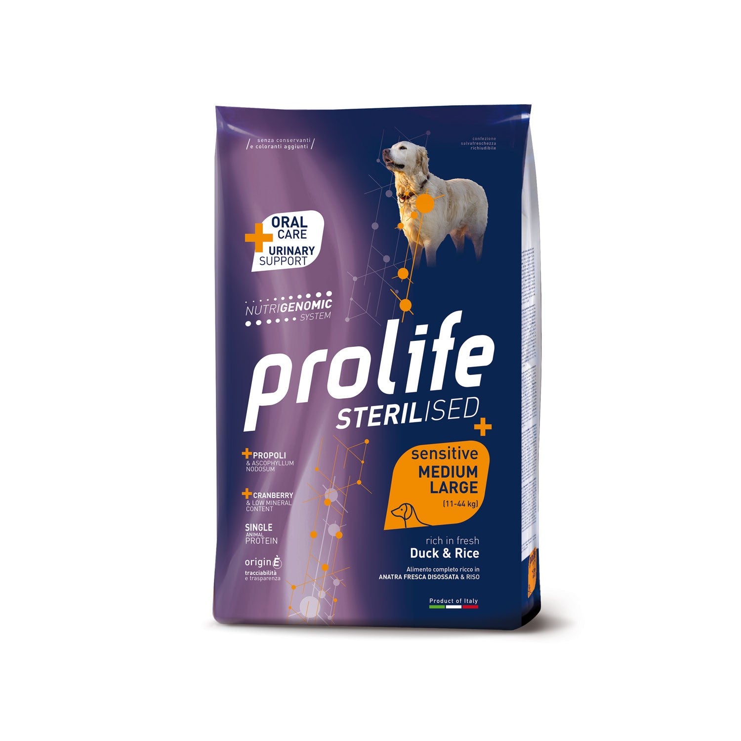 Prolife Sterilised Sensitive Adult Duck & Rice è un alimento secco dietetico appositamente studiato per soddisfare le esigenze nutrizionali dei cani adulti sterilizzati e/o con sensibilità alimentari appartenenti a razze di taglia media e grande. Grazie alla combinazione esclusiva di anatra fresca disossata (30%) e riso altamente digeribile (23,8%), questo alimento offre una fonte proteica nobile, ben tollerata e altamente appetibile, associata a carboidrati leggeri che favoriscono una corretta digestione e un assorbimento ottimale dei nutrienti.