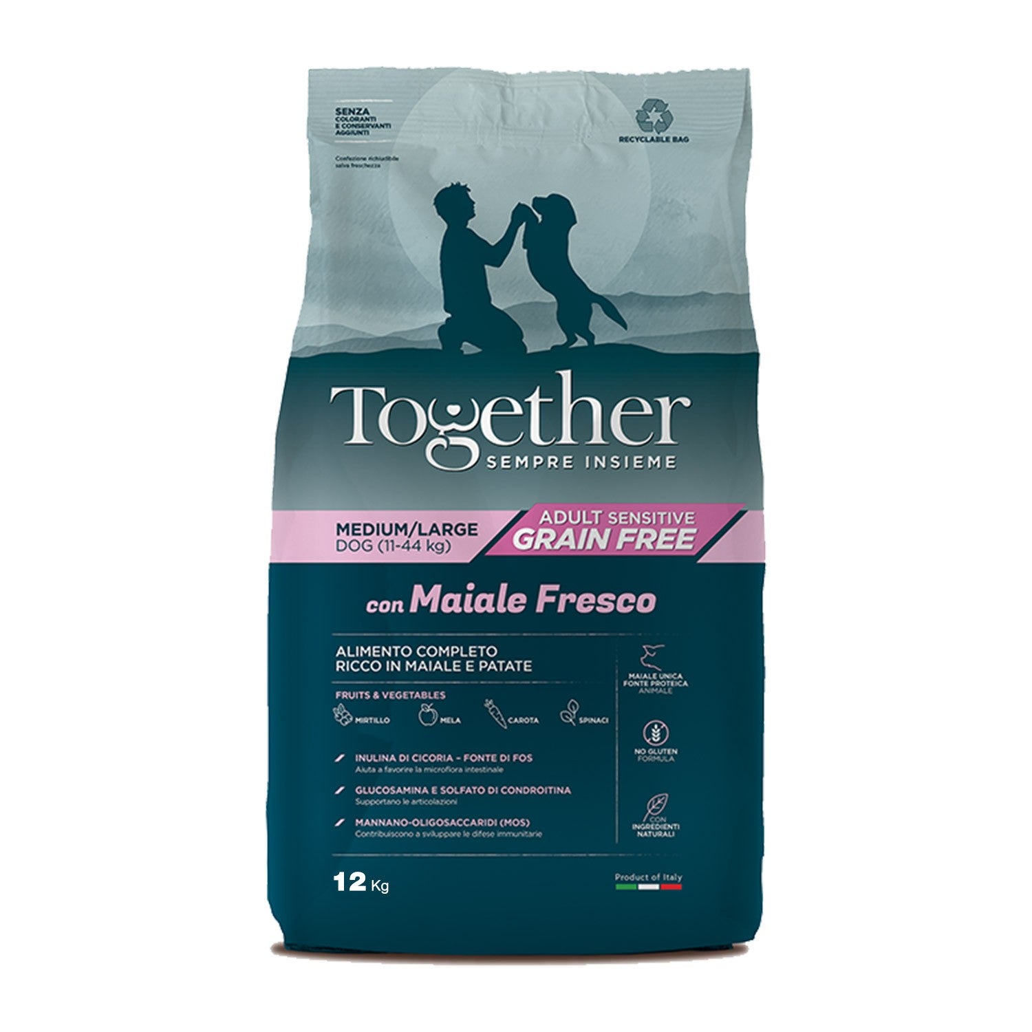 Maiale 30,8% (di cui Maiale disidratato 16,4%, Maiale fresco* 8%, Proteine disidratate di maiale 6,4%), Patate* 21%, Piselli, Tapioca, Grasso di pollo, Amido di pisello, Lieviti, Proteine idrolizzate di maiale, Polpa di barbabietola, Mirtillo 0,23%, Mela* 0,23%, Spinaci* 0,23%, Carota* 0,23%, Inulina di cicoria – fonte di FOS – 0,1%, Mannano-oligosaccaridi* 0,1%, Glucosamina 0,03%, Solfato di condroitina 0,02%, Yucca schidigera* 0,01%.
