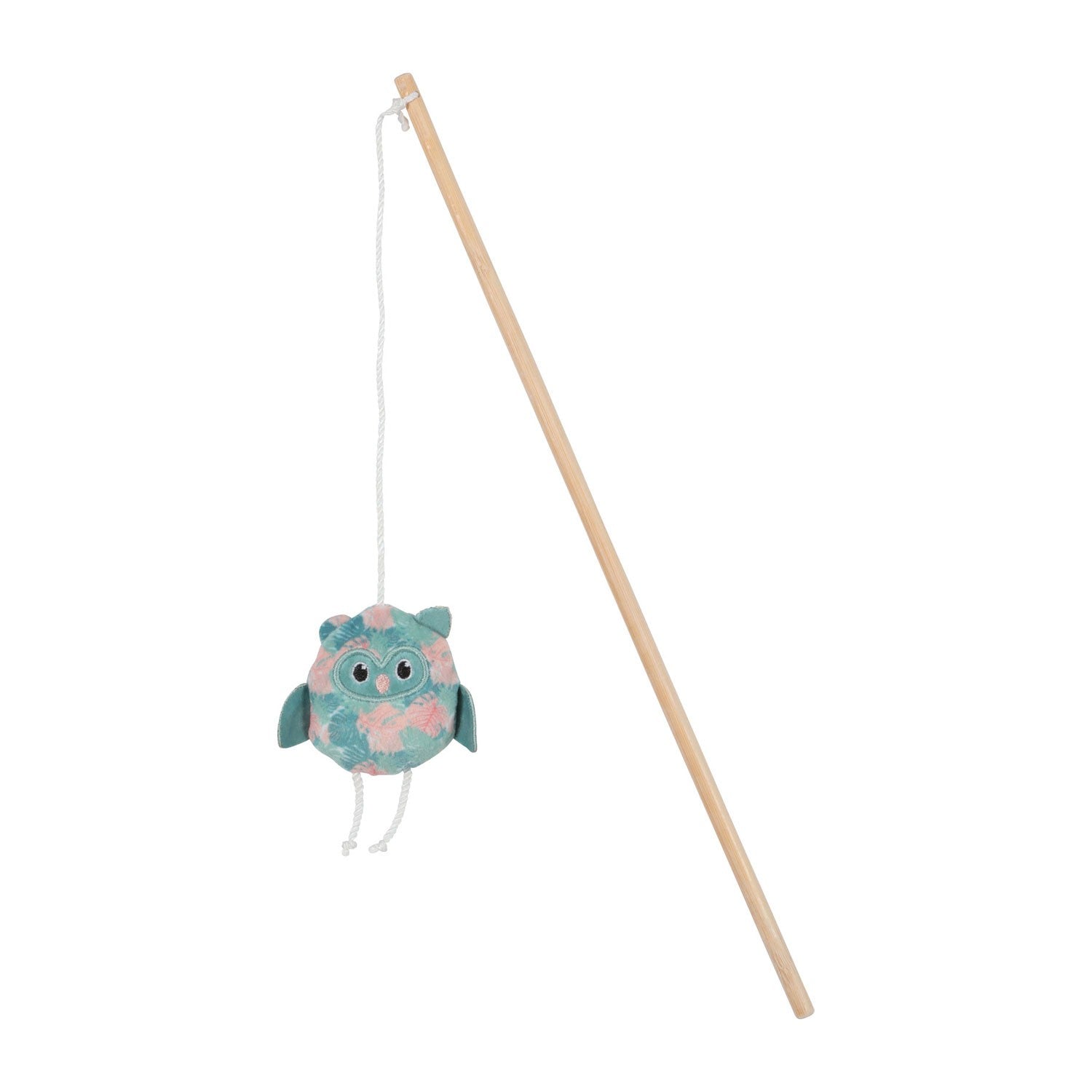 Composto da poliestere riciclato, è costituito da un peluche morbido a forma di gufo con imbottitura, cuciture e ricambi in poliestere 100% riciclato. Presenta un pattern a foglie colorate nelle tonalità pastello che offrono un design elegante ad un gioco funzionale. La presenza di erba gatta all’interno del gioco, lo rende particolarmente irresistibile per il vostro gatto grazie al suo effetto euforizzante. La canna da pesca è composta da un bastoncino in bambù.