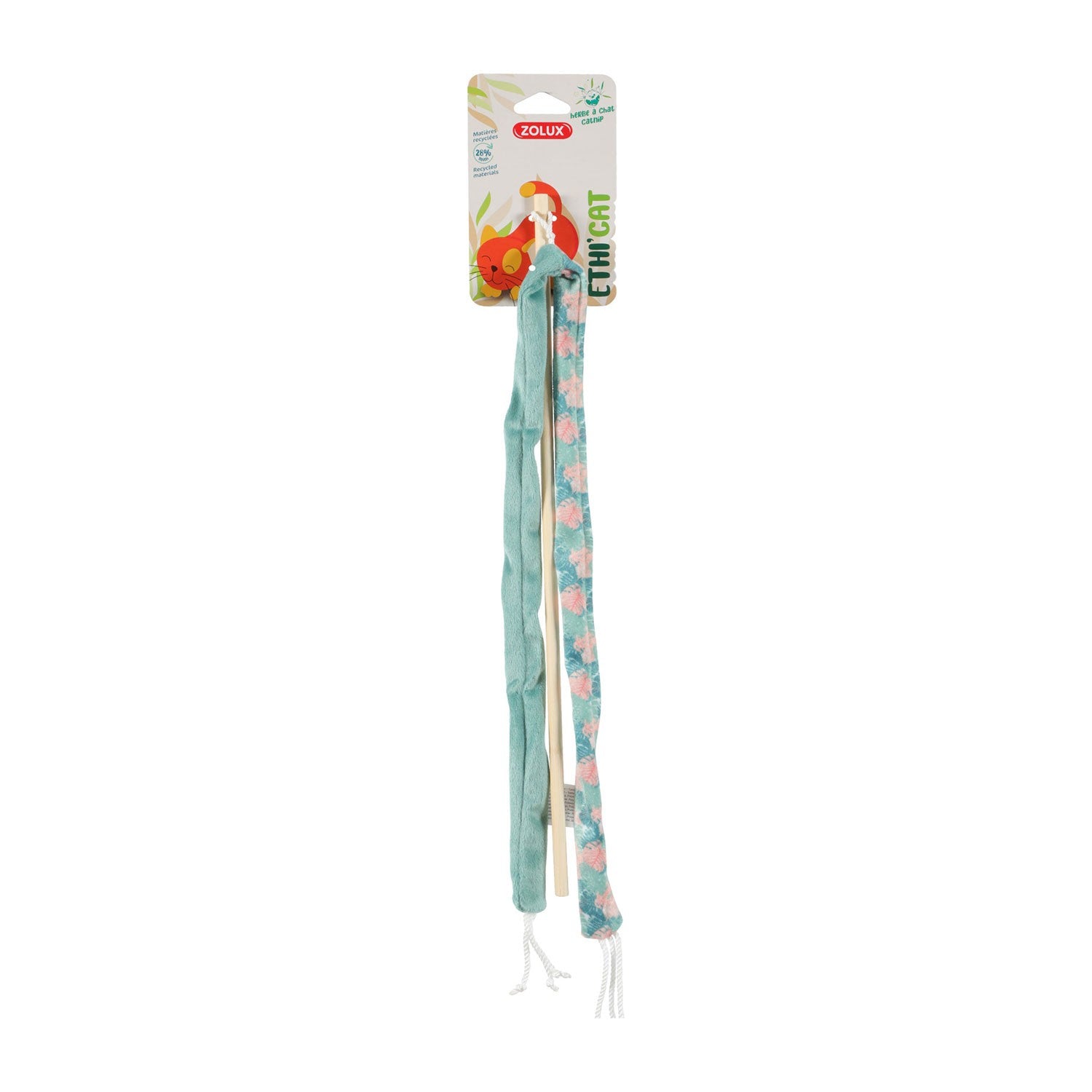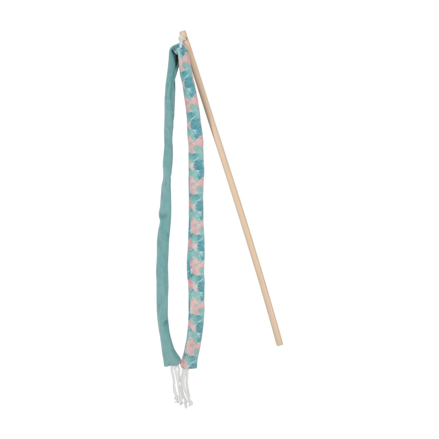 Composto da poliestere riciclato, è costituito da un peluche morbido a forma di nastro lungo con imbottitura, cuciture e ricambi in poliestere 100% riciclato. Presenta un pattern a foglie colorate nelle tonalità pastello che offrono un design elegante ad un gioco funzionale. La presenza di erba gatta all’interno del gioco, lo rende particolarmente irresistibile per il vostro gatto grazie al suo effetto euforizzante. La canna da pesca è composta da un bastoncino in bambù.