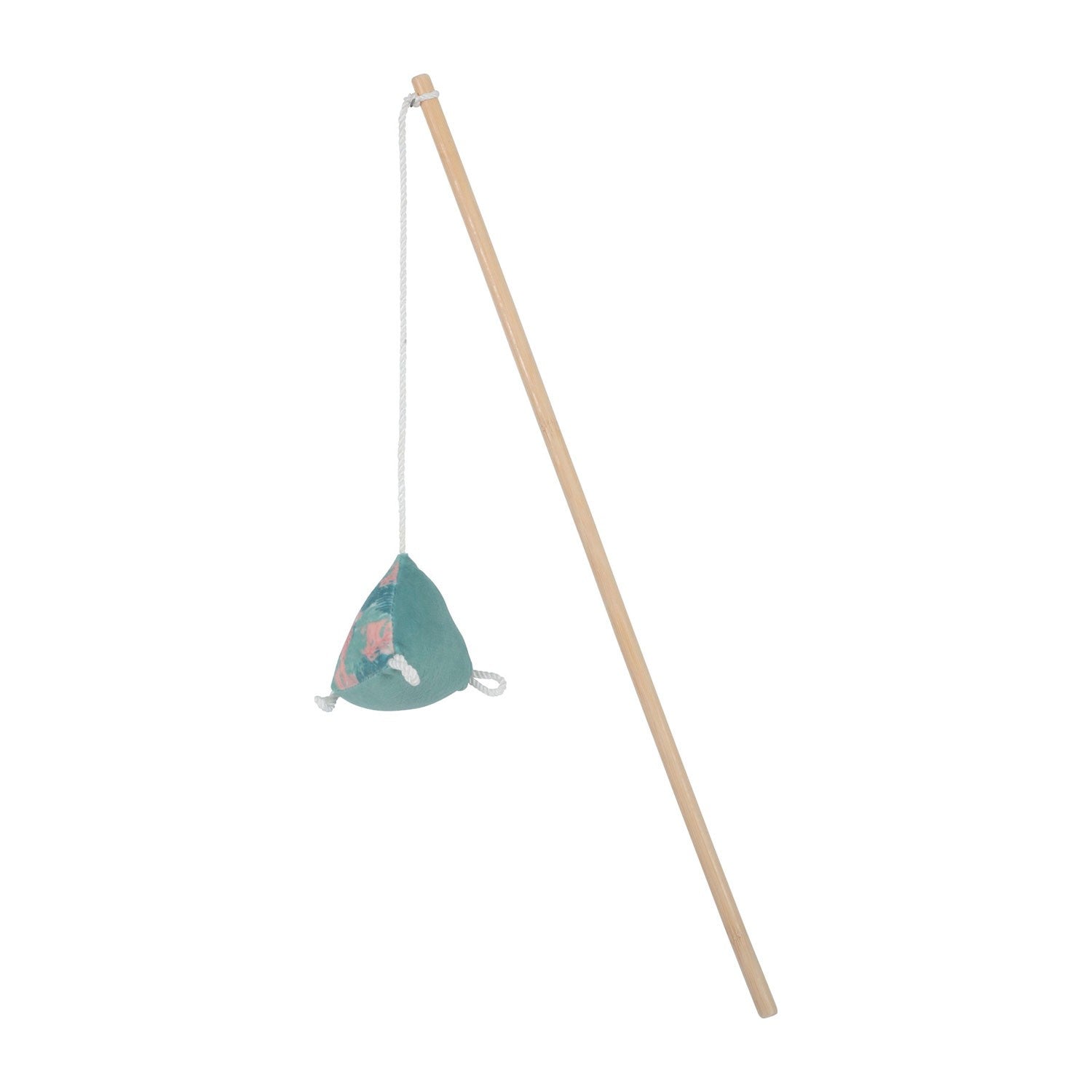 Composto da poliestere riciclato, è costituito da un peluche morbido a forma di piramide con imbottitura, cuciture e ricambi in poliestere 100% riciclato. Presenta un pattern a foglie colorate nelle tonalità pastello che offrono un design elegante ad un gioco funzionale. La presenza di erba gatta all’interno del gioco, lo rende particolarmente irresistibile per il vostro gatto grazie al suo effetto euforizzante. La canna da pesca è composta da un bastoncino in bambù.