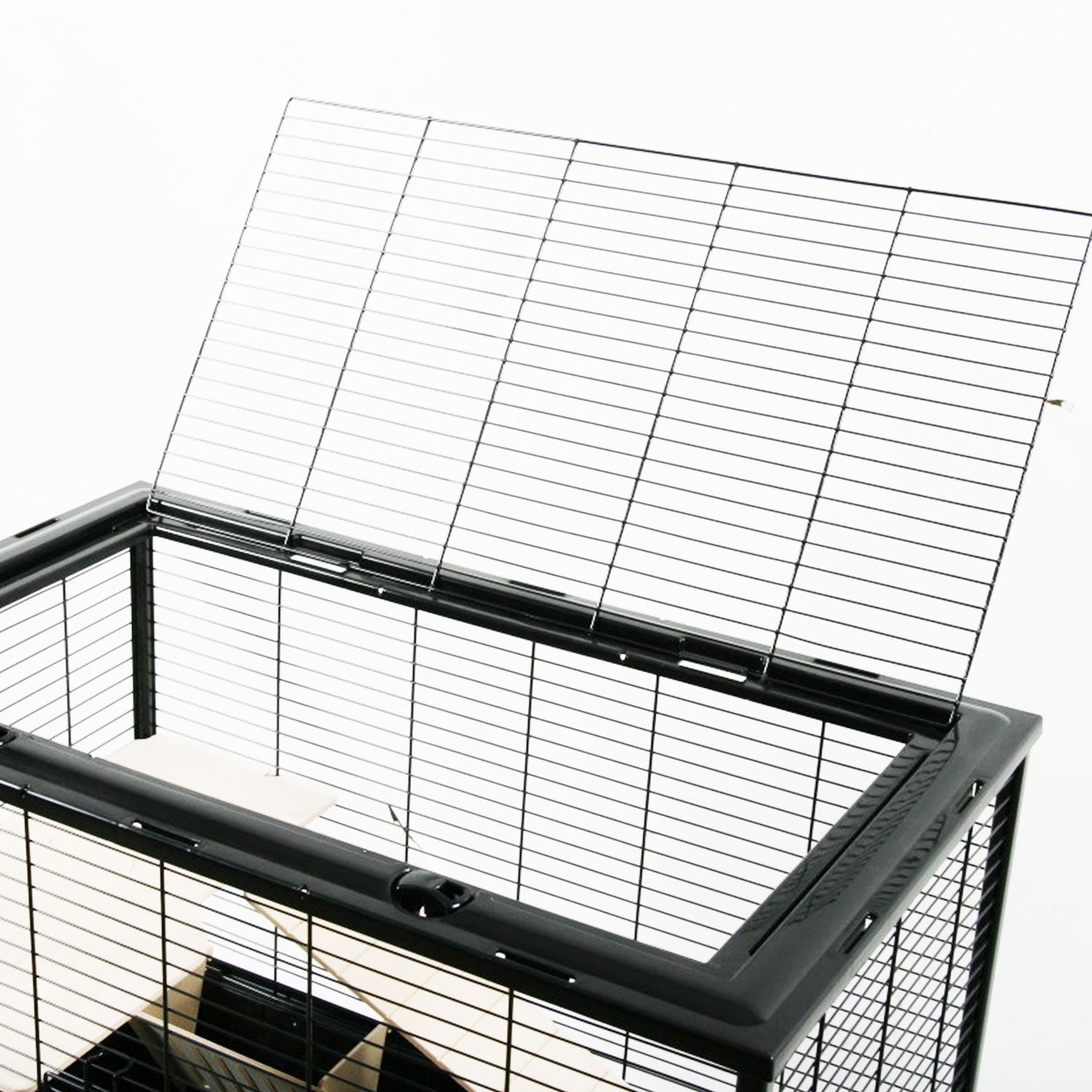 Grazie alla sua particolare struttura, è possibile suddividerla in due pratici piani dove il vostro amico roditore potrà muoversi in tutta libertà. La gabbia è infatti dotata di piano di appoggio e comode rampe solide e facili da montare, oltre ad una simpatica casetta e un portafieno tutto realizzato in legno. L’intera struttura è tenuta in rialzo da quattro piedi in legno massiccio che ne assicurano la stabilità.