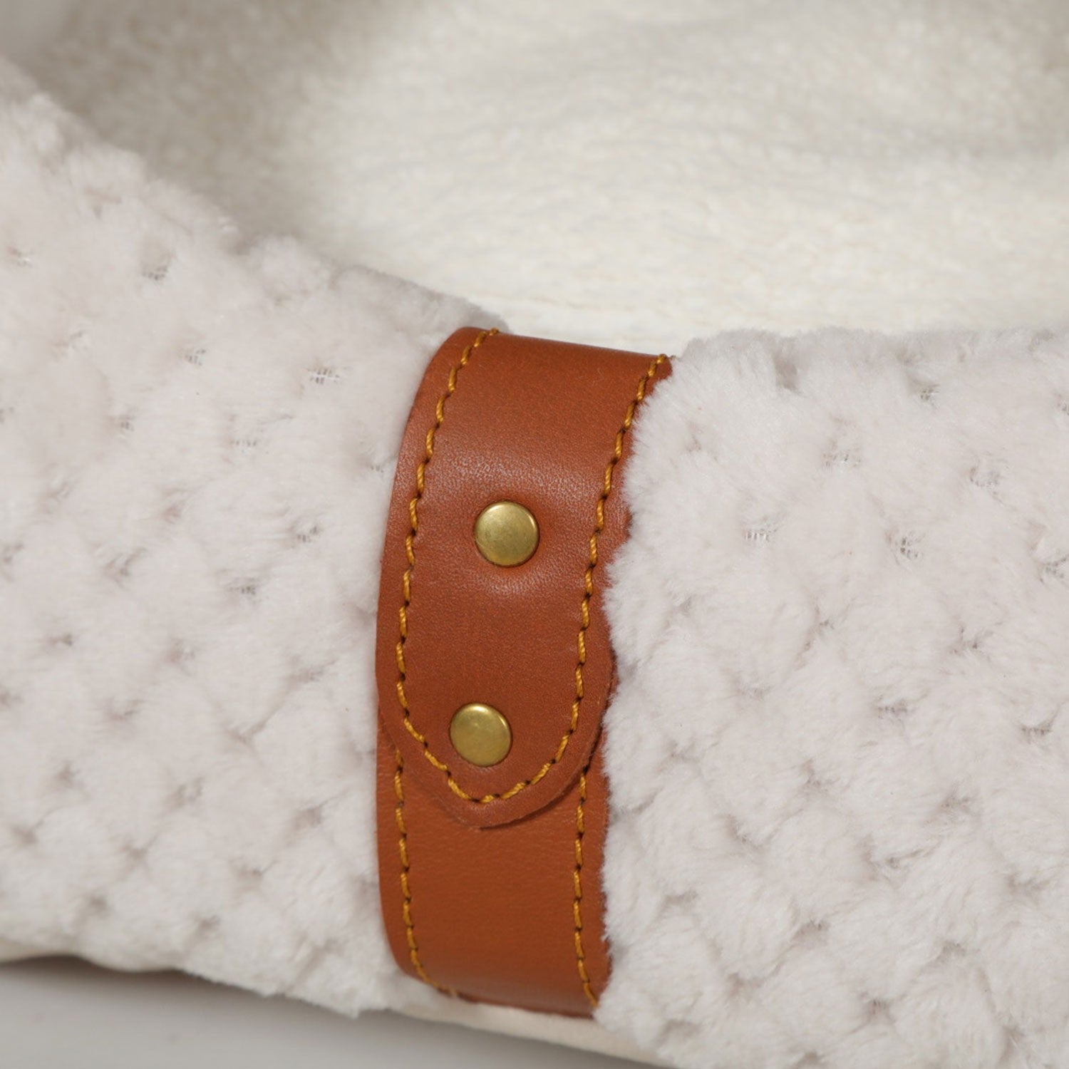 Materiali premium: La cuccia imbottita per gatto è realizzata con materiali di alta qualità, pensati per durare nel tempo e resistere all’uso quotidiano. Il rivestimento esterno include dettagli in pelle color cognac, che aggiungono un tocco elegante e moderno.